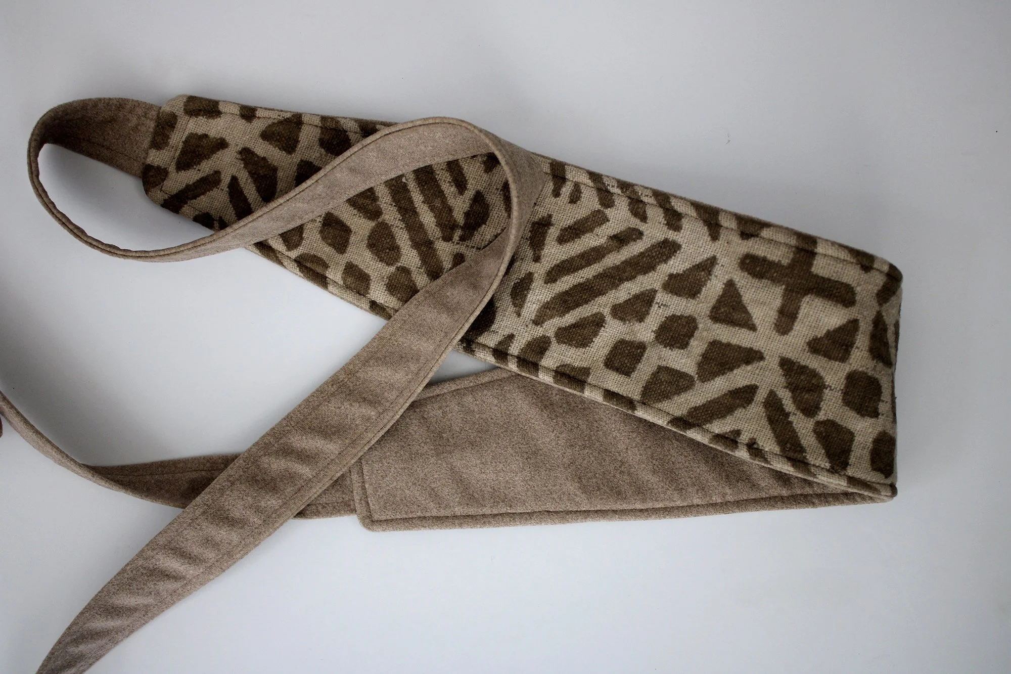 The African Mud Cloth Obi belt consists of vintage, beige, tan and olive colored genuine African mud cloth from Mali.