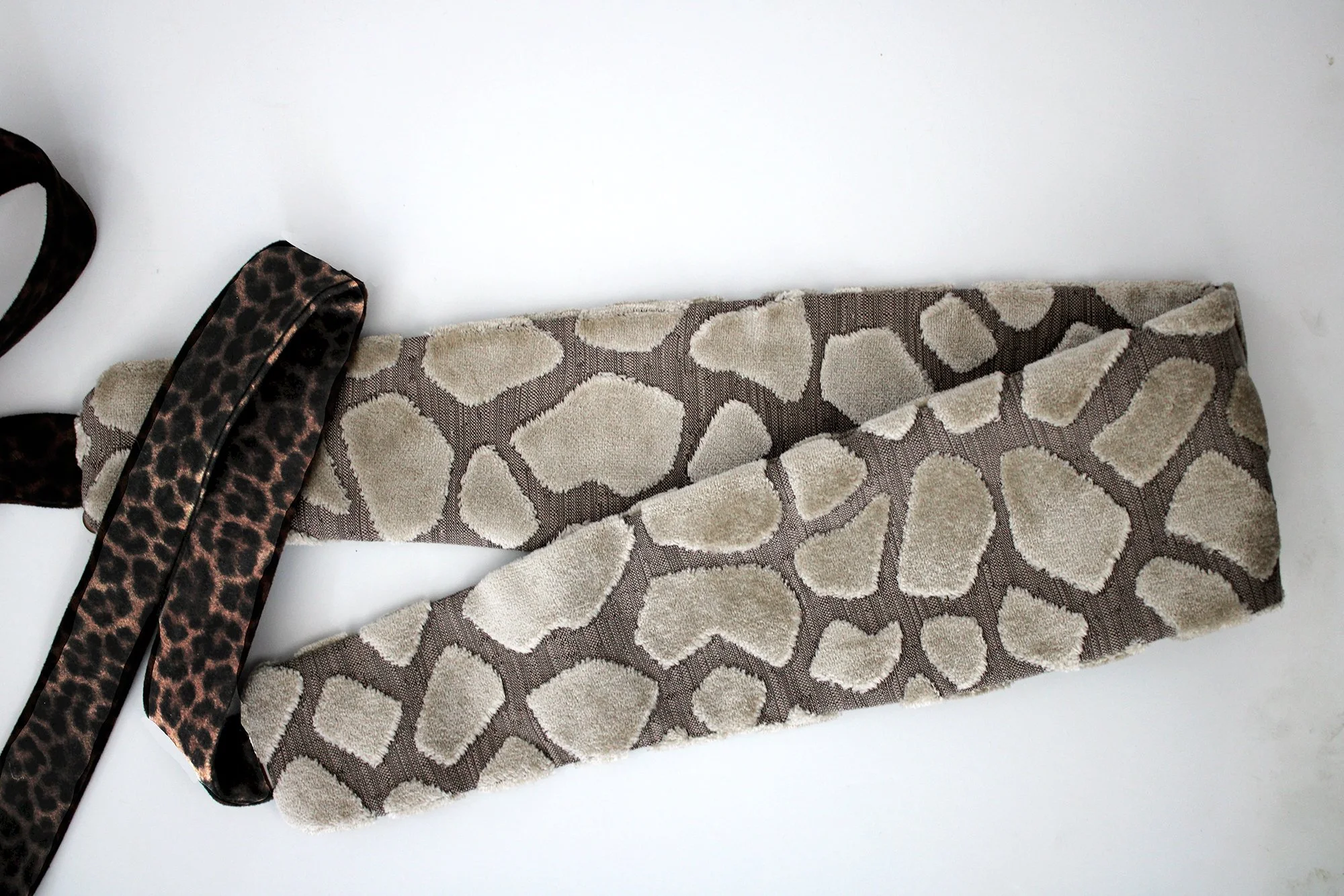 This Obi Belt is made of Chenille Brocade light beige on brown and taupe background. The ties are a leopard print faux suede of brown and black.